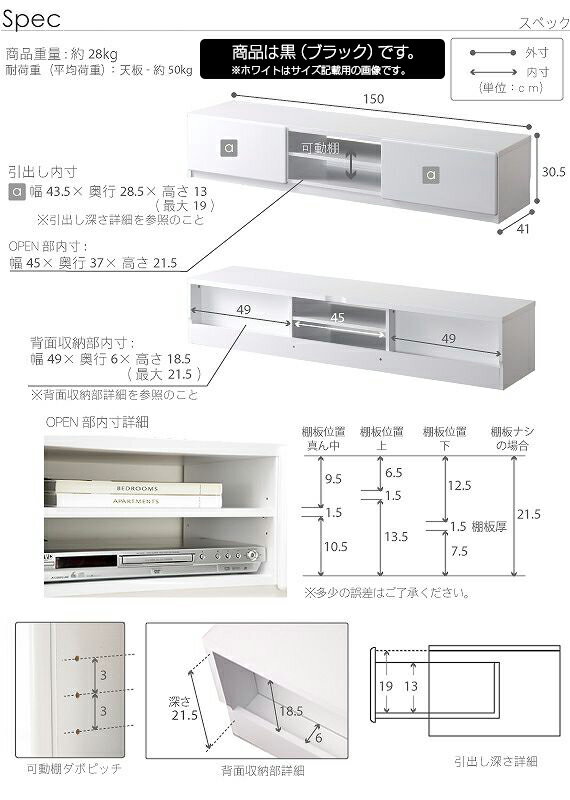 製品サイズ (約)幅150x奥行41x高さ30.5cm 材質 本体:プリント紙化粧パーティクルボード 木口:PVC張り 前板:中質繊維板(鏡面PVC真空貼り) 製品重量 (約)28kg 耐荷重 天板:(約)50kg 組立時間目安 (約)90分 付属品 可動棚板1枚 キャスター付き 備考1 お客様組立て 備考2 黒、ブラック、収納、モノトーン、ロビン、背面収納TVボード、TV台、テレビ台、幅150cm、インテリア、デザイン、シンプル 決済方法について ※メーカー直送のため代金引換はお受けできません。